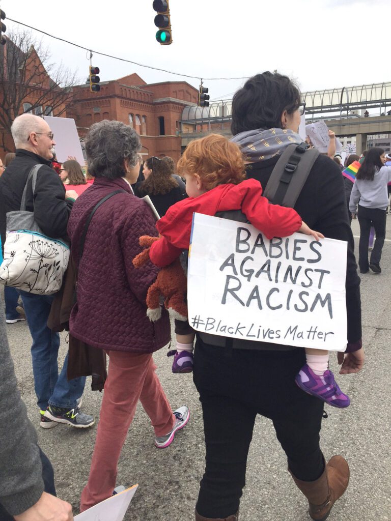 This day was billed as a day for ‘Women’s Marches’ all around the world. But, as the protesters did chant, “Women’s rights are human rights.” The day was more than just for or about women. We were protesting everything the Trump administration stands for. Black Lives Matter activists were present and marching in solidarity, as were those standing up for the rights of Muslims here in our community, and the rights of those with disabilities. Those who are worried for the future of public education under the person nominated for Education Secretary were there as well with their concerns and signs. Entire families were present. My own included three generations. There were tiny babies and the elderly in wheel chairs or with canes. We all helped each other along the cobblestones of Over The Rhine. It was beautiful.